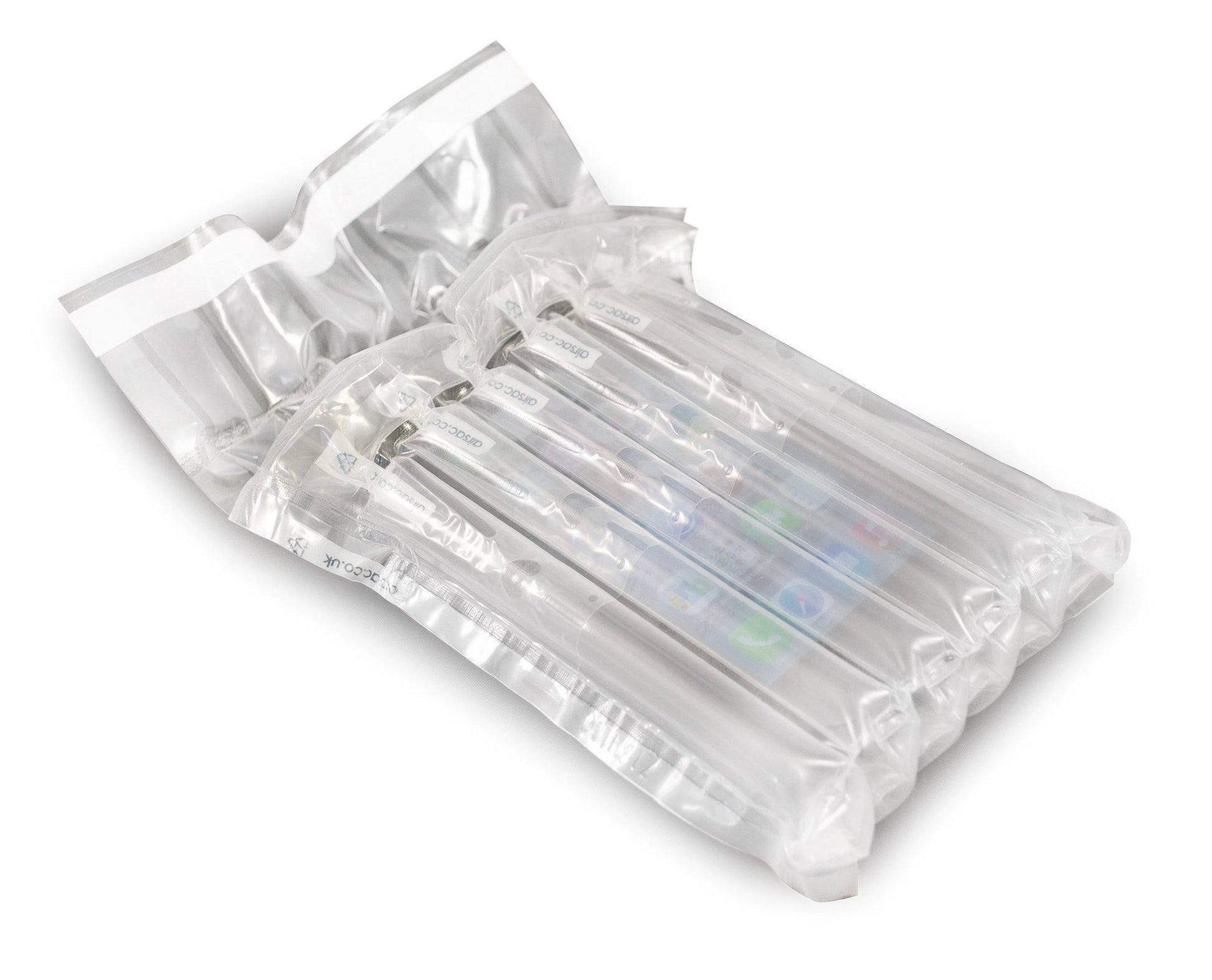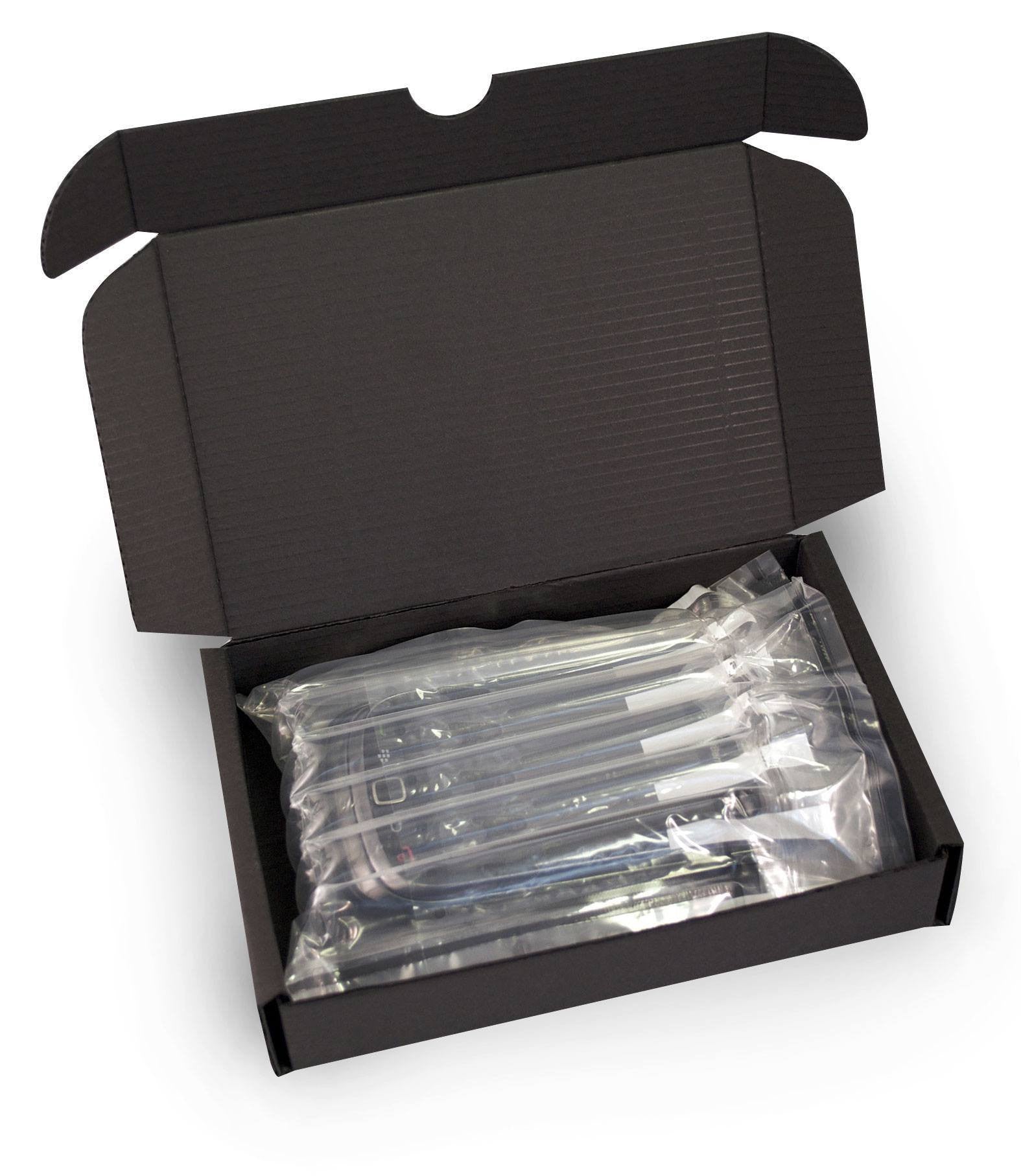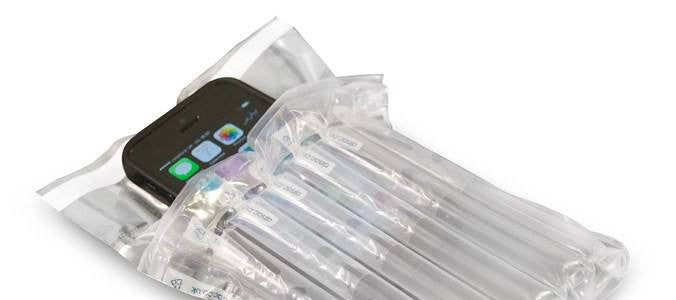 Expanded airsac multi-chamber phone bag within a corrugated box, offers excellent protection and is suitable for shipping.